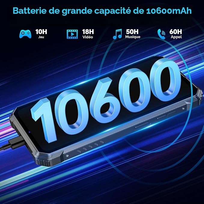 Batterie de grande capacité de 10600 mAh et OTG : le téléphone robuste OUKITEL WP28 S est équipé d'une batterie de 10 600 mAh. Il prend en charge 1000 heures de veille, 60 heures d'appels, 18 heures de vidéos et 50 heures de musique. Il peut fournir une alimentation plus durable lorsque vous jouez à de grands jeux ou regardez des vidéos HD. La fonction de charge inversée OTG peut alimenter d'autres appareils électroniques en cas d'urgence. Le smartphone robuste OUKITEL WP28S est plus adapté pour les voyageurs, les amateurs de plein air et les hommes d'affaires.